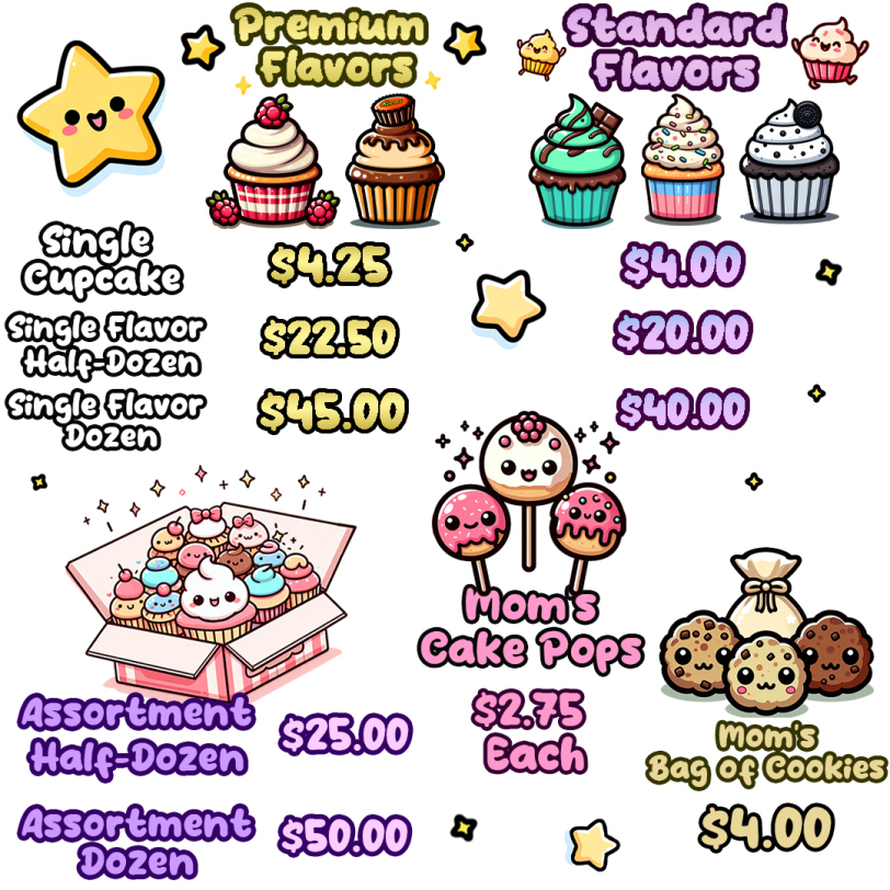 Custom orders, special delivery times, or unique quantities? Fill out this form with your details. Mom will send you a checkout link to get your perfect treats on the way!