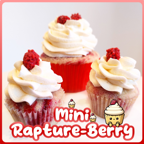 Petite vanilla cake with tangy raspberry center, topped with white chocolate frosting and a tiny berry chocolate.