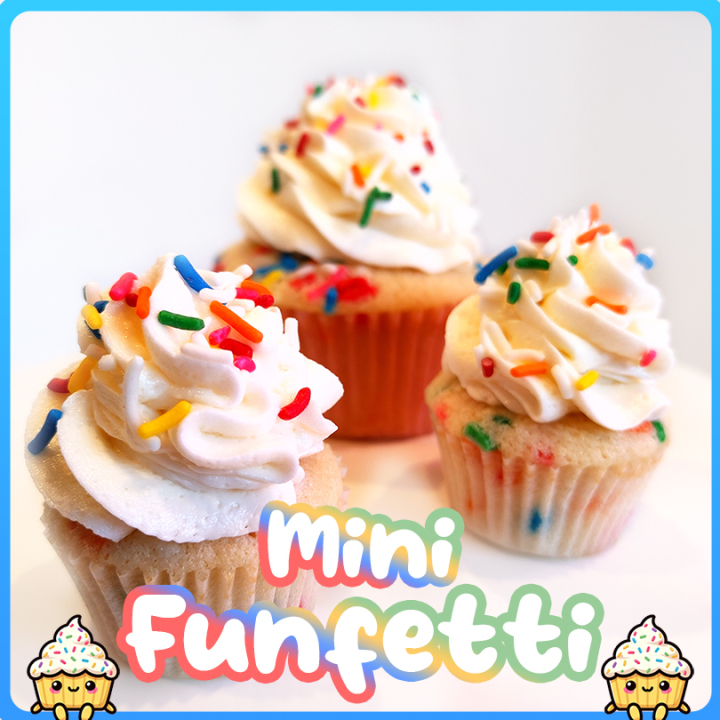 Small vanilla cakes with melted sprinkles inside, topped with white frosting and a sprinkle of