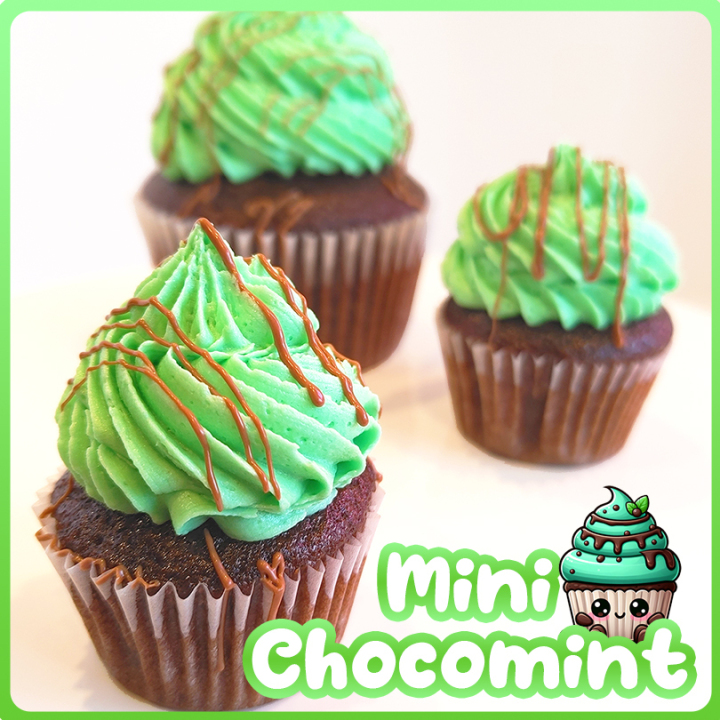 Bite-sized chocolate cake topped with cool, creamy mint frosting and a delicate chocolate drizzle.